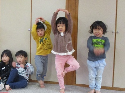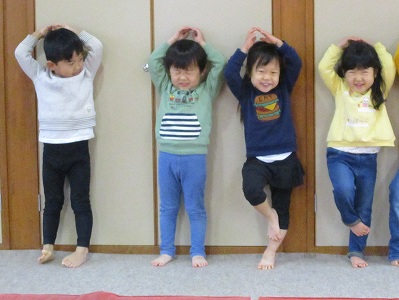 2020年11月26日 舞台で遊ぼう 3歳児 つき 発表会の舞台で遊びました。でんぐり返りをしたり、ポーズを決めたり…順番に行っています。 舞台に上がると、目線が高いから、ちょっといつもと違う気分。でも、「お客さんがいないからあまり緊張しなかった」とはこどもたちの言葉です。たくさん、遊んで発表会が楽しめたらいいなと思います。 ポーズは自分で考えました。 思い思いにポーズ 一覧へ戻る
