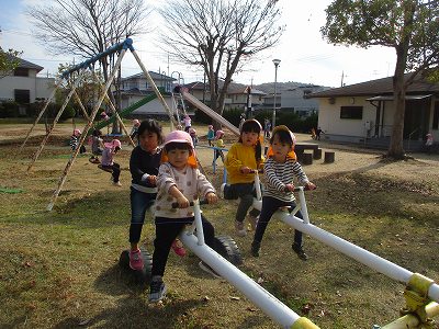 公園の遊具は、鉄棒とすべり台とブランコとシーソー。人気は高いすべり台、全部で4人乗れるシーソーが2台です。ブランコはかわるがわる乗って漕いでいました。鉄棒にも興味を持ってぶら下がっている子がいて素敵だなと思いました。