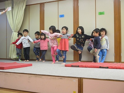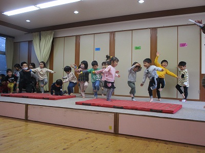 2020年12月02日 発表会おひろめです。 3歳児 つき 2回目の舞台です。今日は4つのグループに分かれて、ドングリになってでんぐり返しや片足立ちをしたりしました。 最後はみんなで『ドングリ坂のドングリ』を一緒に歌いました。 一緒に見せっこした、にじ組やゆき組のみんなにもかっこい姿をほめてもらいました。こどもたちの感想はいかがだったでしょうか?! お家でも聞いてみてくださいね。 片足立ちが出来るかな?時々右足と左足を変えてたってみたよ。 ぴんとまっすぐに両手を広げてバランスをとっています。ぐらぐらしないよ~。 一覧へ戻る