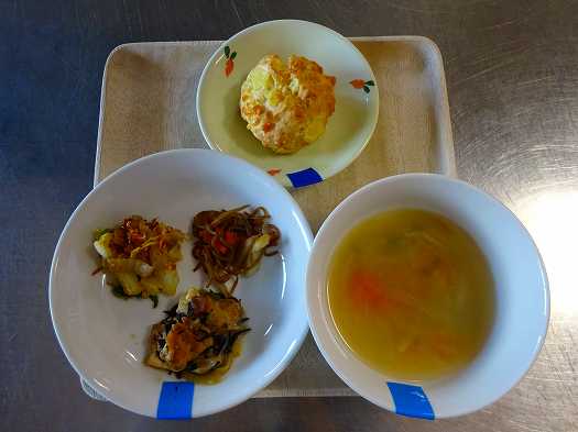2020年12月02日 給食室(11月30日の給食、おやつ) 給食室 昼食 ・ごはん ・厚揚げと鶏肉のひじき煮 ・きんぴらこんにゃく ・白菜のおかか和え ・あさりのみそ汁 おやつ ・りんごとチーズのプチパン ・牛乳 厚揚げと鶏肉のひじき煮はまとまって食べやすいように 片栗粉でとろみをつけています。 白菜のおかか和えはかつお節とごま、しょうゆとシンプルな味付けですが、 こどもたちはよく食べていました。 おたのしみおやつは、りんごとチーズのプチパンでした。 生地はホットケーキミックスのみなので、簡単においしくできます。 お家でもぜひ作って見てくださいね。 一覧へ戻る
