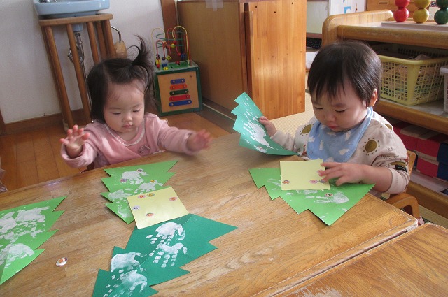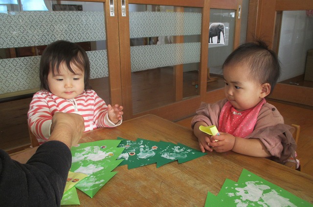台紙から、保育者に剥してもらったシールを画用紙に張り付けていきます。