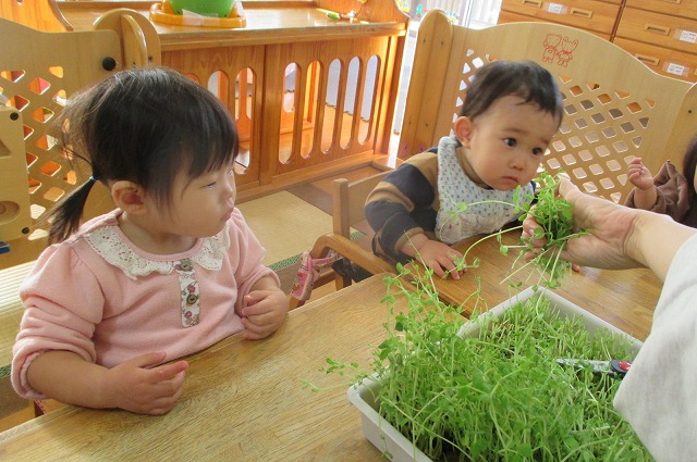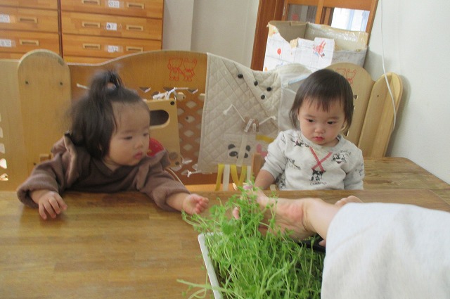 2020年12月08日 豆苗、伸びたよ 0歳児 はな 部屋で育てていた豆苗が伸びました。 ”これが豆苗?”とじっと身を乗り出して見入っていました。 今日、切っておやつの雑炊に入れてもらいます。 楽しみだね。 一覧へ戻る