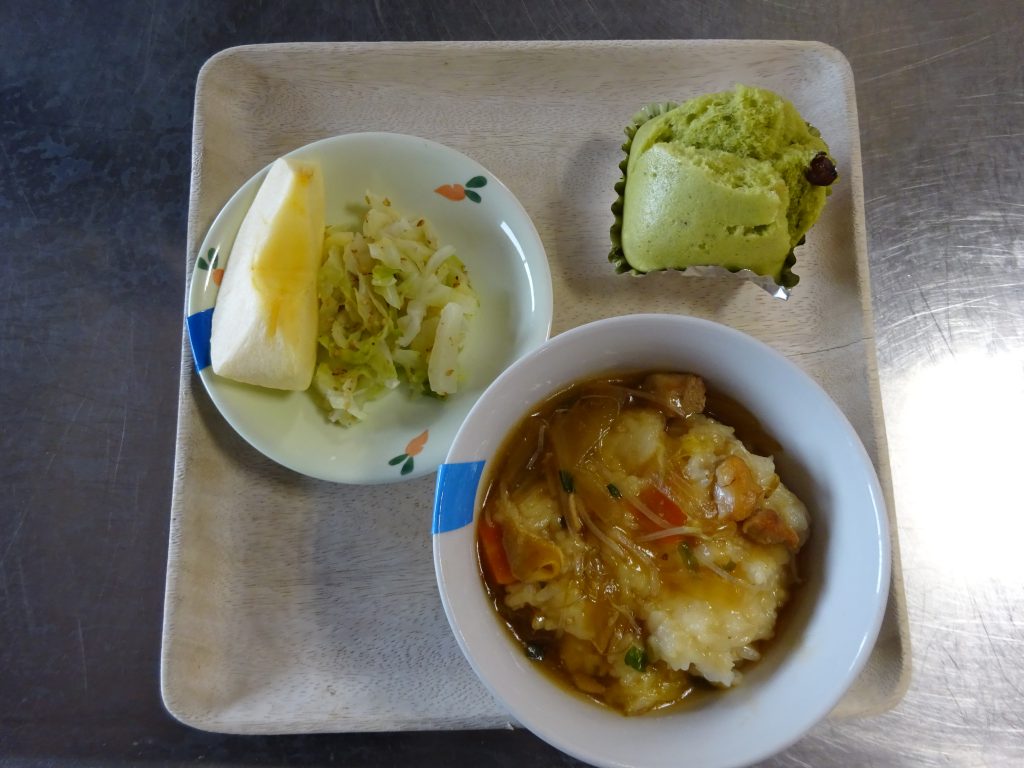 2020年12月11日 給食室(12月10日の給食、おやつ) 給食室 昼食 ・鶏あんかけ丼 ・キャベツのもみ漬け ・りんご おやつ ・抹茶入り蒸しパン ・牛乳 鶏あんかけ丼には鶏肉、たまねぎ、にんじん、白菜、もやし、ねぎが入っています。 具だくさんでとろみもしっかりついていたので、こどもたちも食べやすかったようです。 おやつの抹茶入り蒸しパンには甘納豆を入れました。 スキムミルクも入っているので、カルシウムも一緒に摂れるおやつになっています。 一覧へ戻る