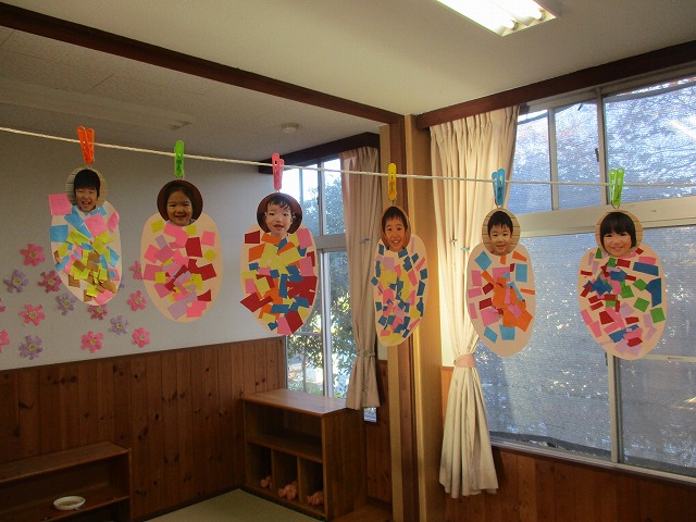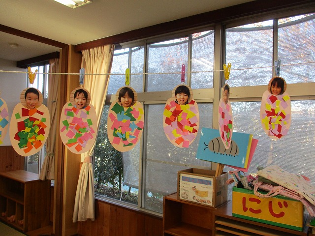 2020年12月16日 仲良く並んで…ぶら~ん。 2歳児 にじ にじ組の部屋に、色とりどりの葉っぱを身につけた みのむしが並んでいます。 はさみで1回切りした画用紙を 1つずつのりで貼っていきました。 のりをつけすぎないように真剣な表情でした。 部屋に飾られているのは、みのむしですが 発表会でも、いろいろな虫になりきって遊びます。 どんな虫たちが出てくるのか、お楽しみに♪ 一覧へ戻る