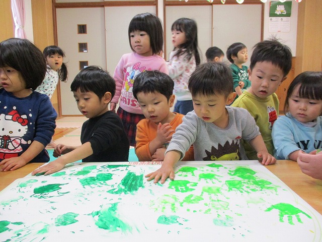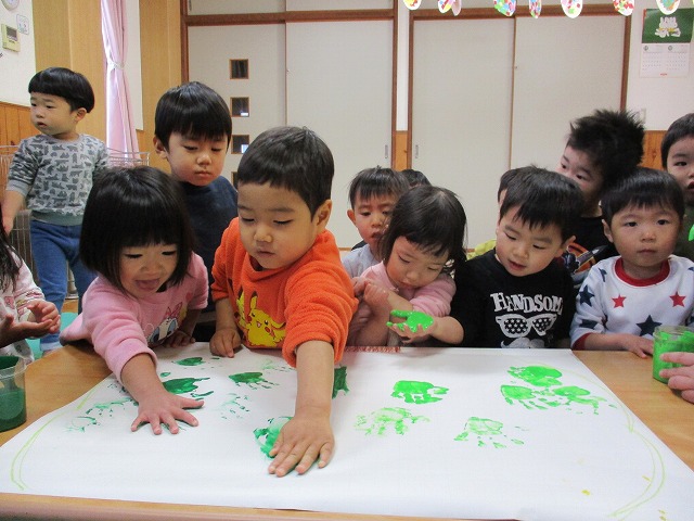 2020年12月16日 ペタペタ…何ができるかな? 2歳児 にじ 発表会の時に使う、背景作りをしました。 黄緑と緑の絵の具を手の平につけて大きな模造紙にペタリ! 白い部分が見えなくなるまでダイナミックに 手形をつけて楽しんでいました。 何ができあがるのか、どこででてくるのかにも 当日のお楽しみに。 一覧へ戻る