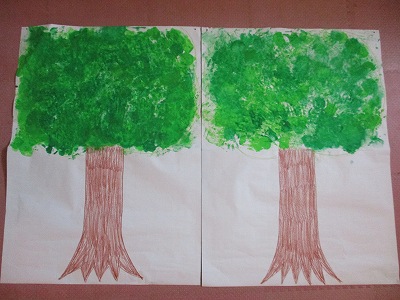 黄緑と緑の手形が色鮮やかな2本の木になりました。