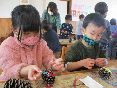 2020年12月24日 クリスマスツリー 4歳児 ほし お出かけ保育のときに拾ったまつぼっくりを使って、クリスマス ツリーを作りました。 モールやスパンコールなどの普段使用しない素材を使ってみると、こどもたちも嬉しそうに飾りつけをしていました。 また、サンタさんから何をもらいたいのか聞いてみると、「変身セット」「ピアノ」「マイク」「スマホ」など様々なプレゼントが欲しいと教えてくれました。 一覧へ戻る