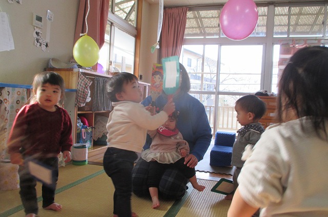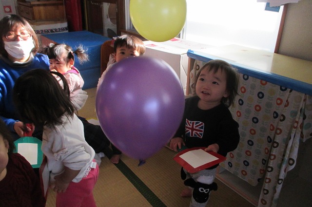 風船や羽を目がけて羽子板(段ボール)を振って当てています。