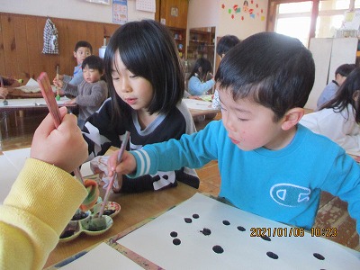 2021年01月08日 ウシボウシ 3歳児 つき 二日にわたり、ウシボウシを作りました。 筆にインクをつけて、ぽんぽんと押しました。 きれいな柄が付いたら乾かして ボウシをかぶってみんなで写真を撮っています。 今年モーいい年になりますように! 一覧へ戻る