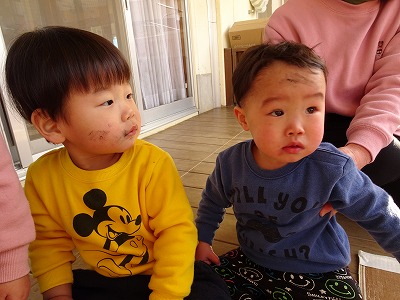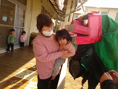 2021年01月15日 健康で過ごせますように 1歳児 ゆき とんどがありました。 お飾りをはやしている、大きな火に大注目です。 獅子舞がやってくると、辛くなりながらも頭を噛んでもらったり、距離をとって様子をうかがたったりしていました。 最後にすすを顔につけて、一年の健康を祈りました。 一覧へ戻る