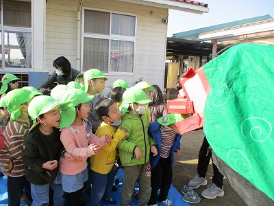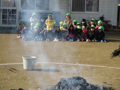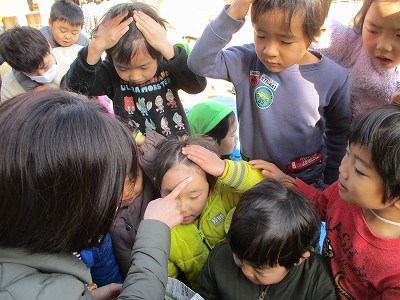 2021年01月15日 とんど 4歳児 ほし とんどがありました。 獅子舞が来ると、「怖い」と怖がる子もいましたが、怖い子の肩をトントンと寄せ合う子や、自分から頭を噛んでもらいに行く子、とさまざまでした。 みんなが一年間健康に過ごせますように…という願いを込めながら、すみを顔に塗ると、友だちと見つめ合い、嬉しそうでした。 一覧へ戻る