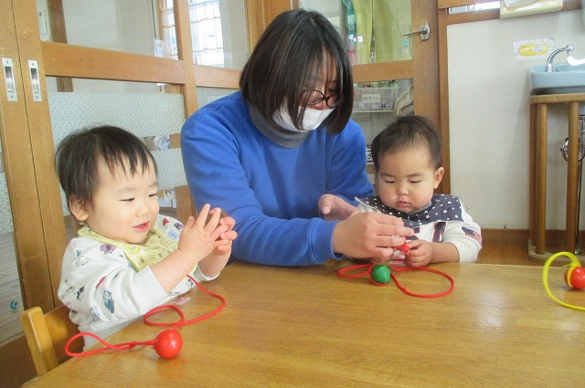 2021年01月18日 ヒモが通るかな? 0歳児 はな 初めてのひも通し。 保育者の姿を真似て、穴に向かってひもを通していこうとしていました。 しかし、通ったひもを引っ張るように伝えたリ、見せたりしても どおしても押さえつけて、穴に戻そうとするこどもたちでした。 一覧へ戻る