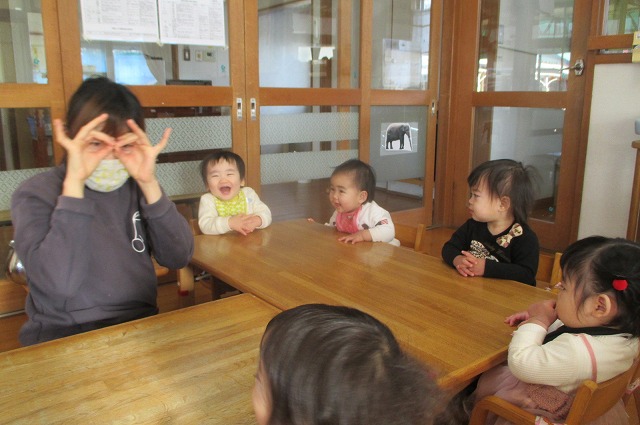 2021年01月25日 トントントントン… 0歳児 はな 朝のおやつの時に、手あそびをしています。 その中でも、“トントントン ひげじいさん”がお気に入りです。 保育者が両手を、身体の部分にくっつけるたびに大笑い。 こどもたちの中で、何かツボに入っていたようです。 一覧へ戻る