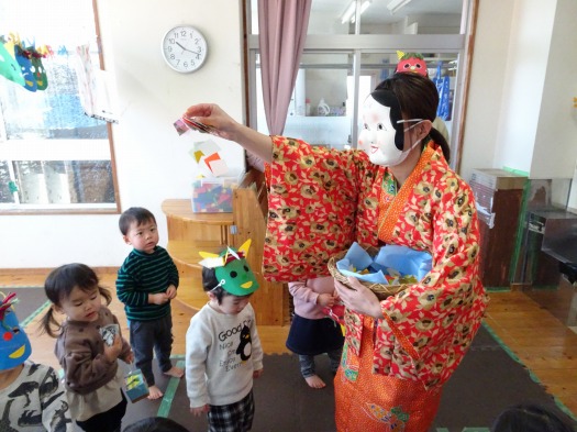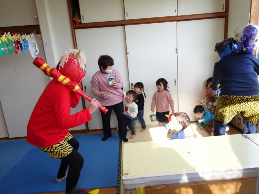 2021年02月02日 おには~そと! 1歳児 ゆき ゆきぐみにも鬼がきました。 鬼が来る前は、「おには~そと」と声をあげながら、新聞豆を投げていたこどもたちですが、本当に鬼が来ると顔がこわばり、隅っこに逃げていました。 棚の中に入ったり、大人のそばに行ったりと、逃げ方はそれぞれです。 豆を投げることを忘れてしまうくらい、迫力があったようです。 お福さんも来てくれ、一年の健康を祈りました。 一覧へ戻る