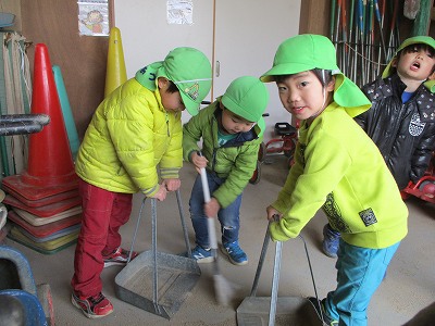 朝、遊具が入っている倉庫の中が土で汚れていました。保育者がきれいにしようとすると、「掃除するわ」とこどもたちの声が。