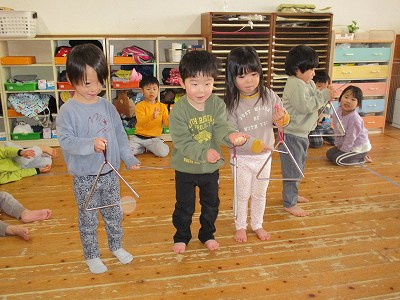 初めてトライアングルを使い、日頃聞いている音とは違うのに
