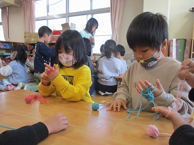 2021年02月12日 指編みに挑戦 5歳児 そら 毛糸を使って指編みをしました。 やり方や指の使い方が難しかったようで、「どうやるん」「できん」と苦戦していましたが、繰り返す中でできる子も出てきました。 やり方が分かった子が先生となり、「ここをこうやって…」と教える姿もありました。 また、時間がある時にゆっくり取り組んでみたいと思います。 一覧へ戻る