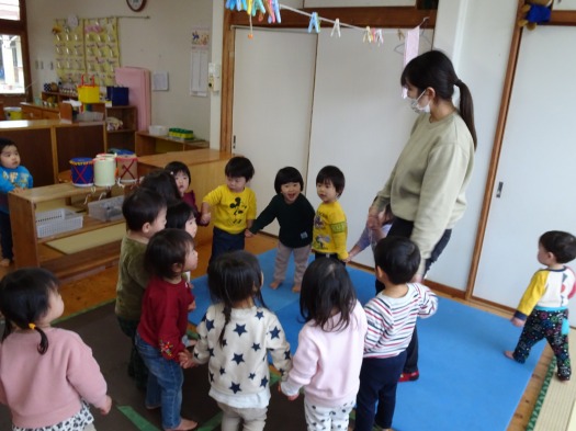 2021年02月12日 手をつなごう♪ 1歳児 ゆき “手をつなごう”という音楽に合わせ、友だちと手をつないで遊びました。 うたを歌うと自然と手をつなぎ始め、少しずつ輪を作ることができました。 「ぽんっぽんっぽんっ♪」に合わせ、ジャンプするのが楽しいようで、その部分が来ると満面の笑みで飛び跳ねていました。 一覧へ戻る