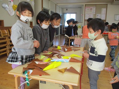 2021年02月26日 お店へGO 3歳児 つき お店屋さんに行きました。 そら組の、お店屋さんでたくさんの買い物ができました。 「先生、お金二つでふたつ買い物ができたよ!」と喜ぶつき組がたくさんでした。 一覧へ戻る