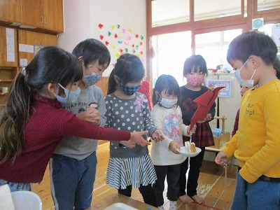 2021年02月26日 パンやさん 4歳児 ほし からすのパンやさんにちなんで、おやつがパンの日はこどもたちから「パン屋さんする」と言い、つき組までおやつのパンを売りに行きます。 つき組の友だちがパンを取りに来たら「ここに並んでください」と伝えては「どうぞ」と渡しています。 発表会が終わってからも、からすのパンやさんで楽しんでいます。 いらっしゃいませ 一覧へ戻る