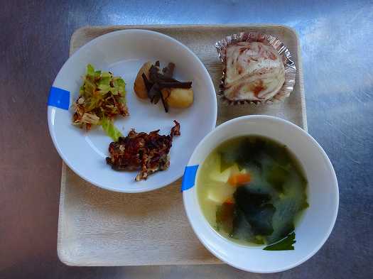 2021年03月01日 給食室(3月1日の給食、おやつ) 給食室 昼食 ・ごはん ・豚肉のねぎ焼き ・里芋の煮物 ・えのきの梅おかか和え ・豆腐のみそ汁 おやつ ・マーブル蒸しパン ・牛乳 豚肉のねぎ焼きは、みりん、酒、しょうゆ、ごま油で味つけています。 ごま油が入っているので香りよく、食欲のそそる一品です。 えのきの梅おかか和えは、えのきとキャベツをしょうゆと梅干し、 かつお節で味つけしました。えのきとキャベツの食感が楽しい副菜です。 おたのしみおやつは、ココアのマーブル蒸しパンでした。 一覧へ戻る