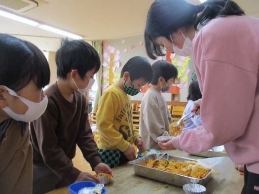 2021年03月13日 考えながら 5歳児 そら 弁当箱に、給食室の職員が作った具材を、自分でお弁当につめました。 どれくらいの量を入れたら全部入るか考えて、保育者に「もっと入れて」「少なめにして」などと言ってお弁当箱に入れていきました。 完成すると「全部入った」と嬉しそうなこどもたちでした。 一覧へ戻る