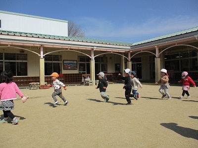 2021年03月26日 走って、取って 2歳児 にじ しっぽとりをしました。 今回は、ちょうど四角い線が引いてあったので、その中でしました。 友だちや保育者のしっぽを取ったり、自分のしっぽが取られないように元気よく走り回ったりしています。 体力がついてきているこどもたちです。 一覧へ戻る