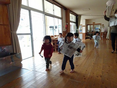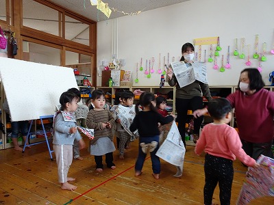 2021年03月25日 聖火ランナー 1歳児 ゆき 新聞を使って聖火ランナーごっこをしました。 園舎内を少し回り、つきぐみでは手遊びを披露しました。 つきぐみからは、うたのお返しがあり、最後は聖火の火を分けあい、交流しながらごっこあそびを楽しみました。 ペアクラスでの交流は楽しいね。 一覧へ戻る