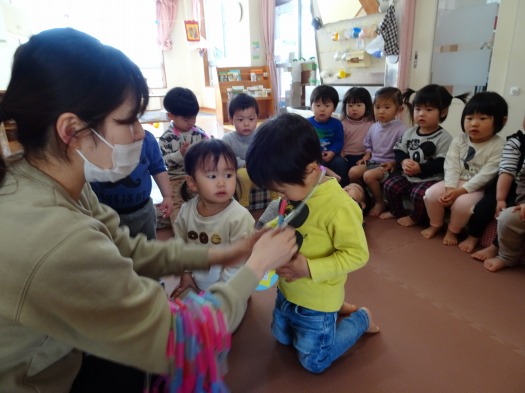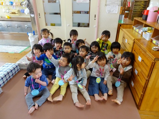 2021年03月26日 大きくなったね 1歳児 ゆき 一年間、たくさん成長したみんなにペンダントを送りました。 一人ずつ名前を呼ぶと、大きな声で返事をして前に出てきます。 ペンダントをもらうと嬉しそうな表情です。 紐の部分は自分たちでストローを通して作っています。 最後に記念撮影をし、「2さい」とかわいいポーズも決めています。 にじぐみでも、元気いっぱい過ごしてね。 一覧へ戻る
