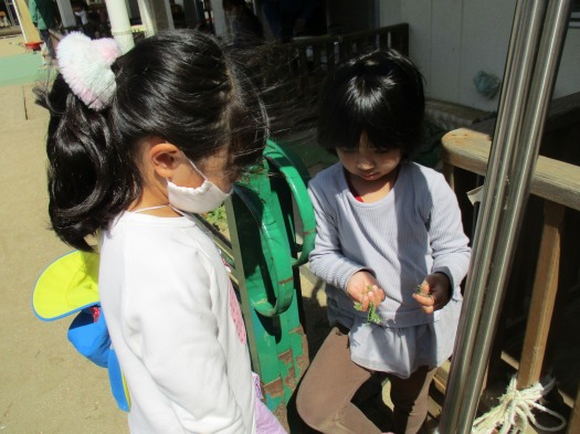 2021年03月27日 春を見つけたよ 5歳児 そら 外であそんでいると園庭に咲いている草花を摘んでいました。 友だちと一緒に「ここもあるかな」といろいろな所を探していました。 見つけると「こんなにあったよ」と保育者に見せてくれました。 一覧へ戻る
