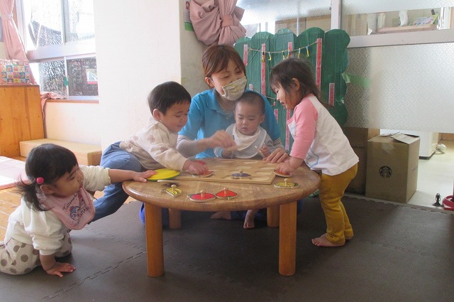 何とかパズルをはめようとするこどもたちです。