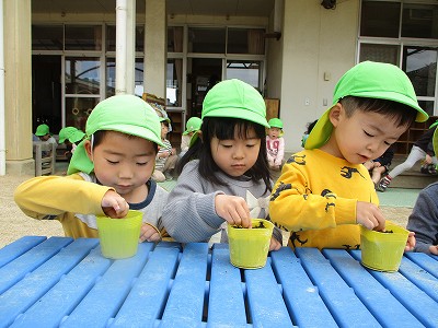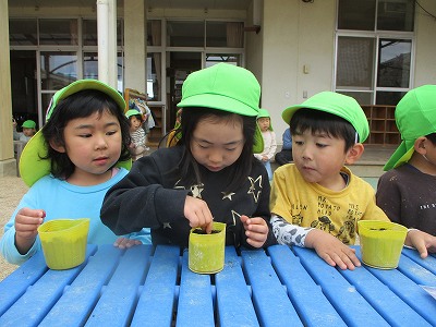 2021年04月07日 出てくるかな? 4歳児 ほし 進級会の時にもらったトウモロコシとオクラの種を 1人1つずつポットにまきました。 赤色と青色の小さな種を落とさないようにそっと 土に開けた穴の中に入れていました。 まずは無事に芽が出ることを願って こどもたちと一緒に水やりをしながら、成長を見守りたいと思います。 また変化があればホームページでお知らせしますね。 一覧へ戻る