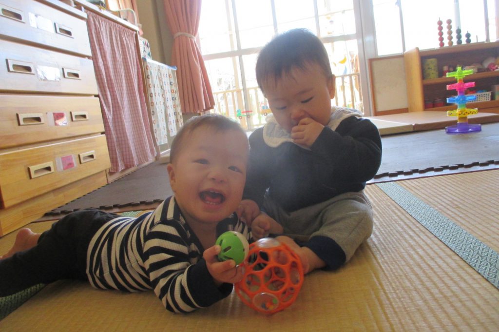 その中でもこどもたちがお気に入りなのは、音が鳴るボールや手で持ちやすいカップです。ボールを転がしたり、手にもって振ってみたりと音が鳴る様子を楽しんでいます。