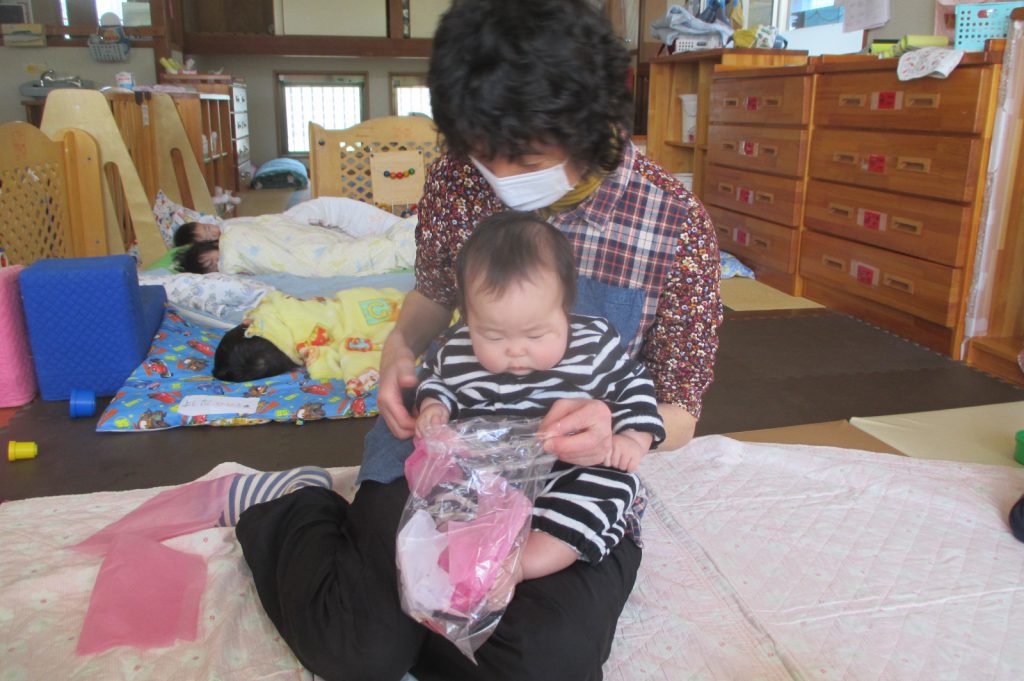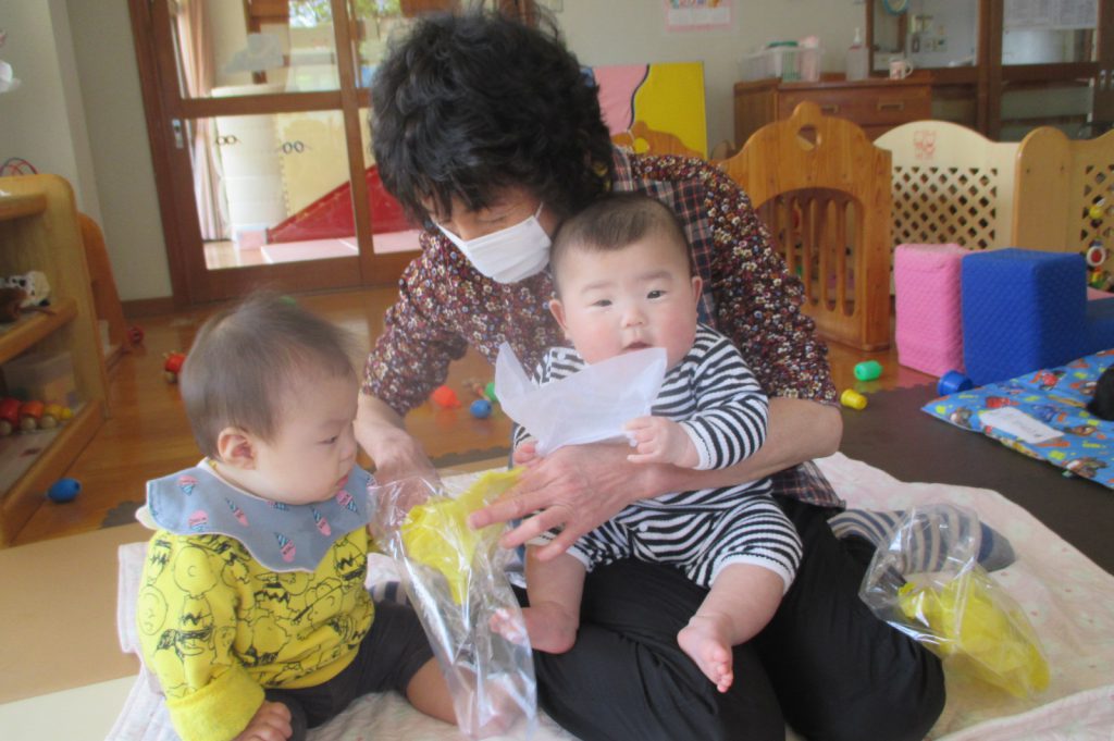 こいのぼりの製作をしました。フラワーペーパーを見せると“何だろう?”と不思議そうにじーっと見つめ、手を伸ばすこどもたち。手に取るとぐしゃぐしゃ感触を楽しんだりちぎったりしていました。柔らかい紙なのでちぎりやすく簡単に“ビリビリ”とちぎるのでした。