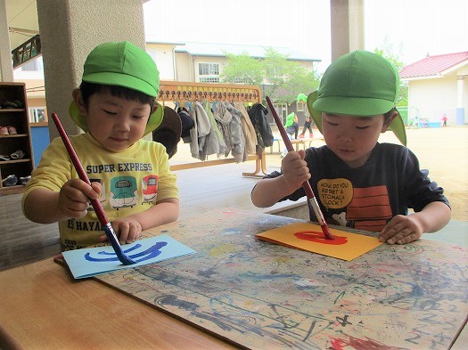 まずは画用紙の半分に絵の具で線や丸などを描いて