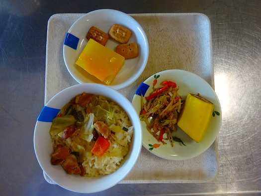 2021年05月08日 給食室(5月6日の給食、おやつ) 給食室 昼食 ・鶏あんかけ丼 ・もやしとさきいかの和え物 ・バナナ おやつ ・オレンジゼリー ・かんぱん もやしとさきいかの和え物は食感のよい、カミカミメニューです。 しょうゆとごま油で中華風に味つけしました。 おやつはみかん缶が入った、オレンジゼリーです。 日中の気温が高くなり、スルッと食べやすいゼリーに おかわりが進んでいたようです。 一覧へ戻る