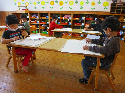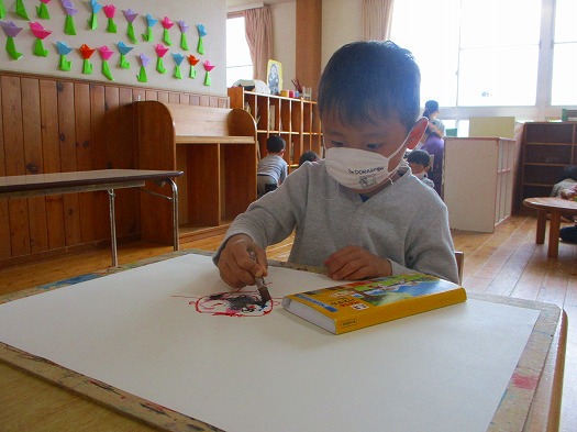 2021年05月07日 何を描こうかな? 4歳児 ほし クレヨンを使って描画をしました。 自分や家族の顔、トラなど自分でイメージしたものを紙いっぱいに描く子や, 1つのものを細かく描く子など、さまざまな姿が見られました。 これからもクレヨンだけでなく、絵の具なども使って、 表現することを楽しみたいと思います。 一覧へ戻る