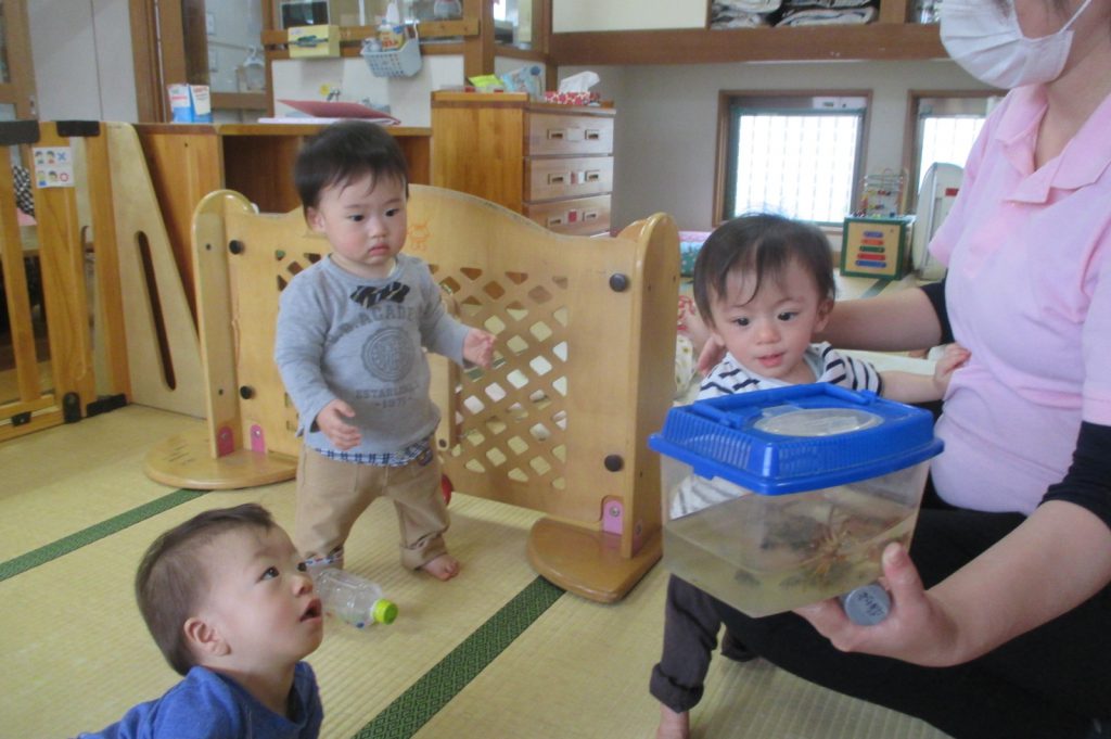 2021年05月12日 カニさんこんにちは 0歳児 はな はな組の保育室にカニがやってきました。“何が来たの?”と興味津々のこどもたち。 近くでじーっと見つめたり少し遠くから様子をうかがったりしていました。 「カニさんご飯食べているね」や「カニさん遊んでいるね」などと声をかけ、こどもの興味をもつ姿に寄り添っていきたいです。 一覧へ戻る