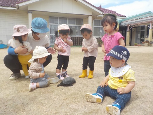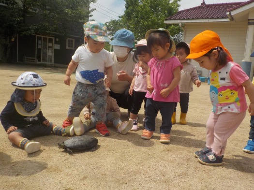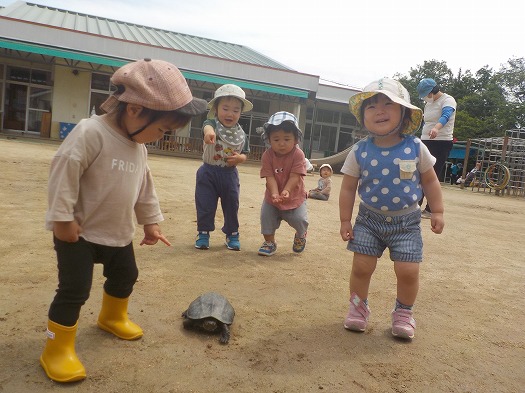 園庭でカメが歩くと、こどもたちは「きゃー」と喜んだり