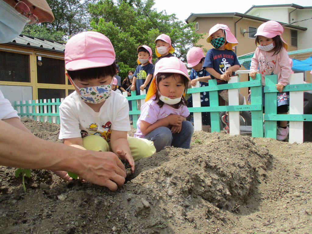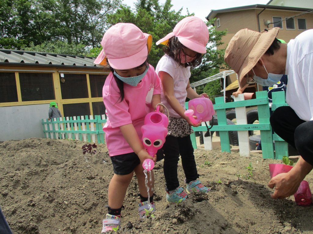 4月に種を蒔いていたものが大きくなり、オクラとナスの苗を園庭の畑に植えました。