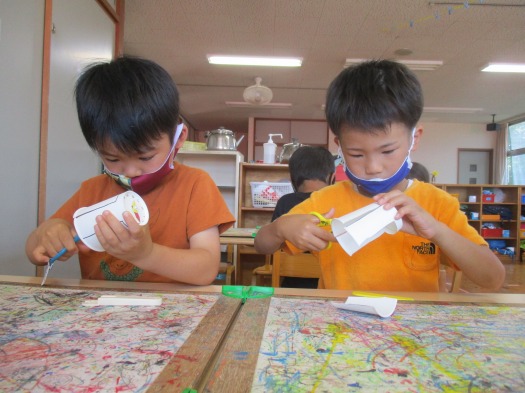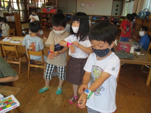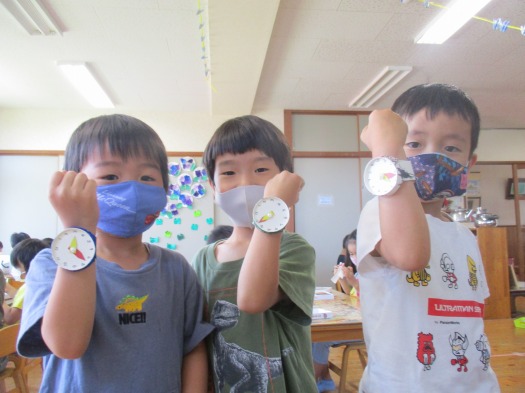 2021年06月10日 時の記念日 5歳児 そら 6月10日は“時の記念日”ということで、 時間の大切さについて話をした後、紙コップで腕時計を作りました。 線の上を器用にハサミで切り、マーカーで自由に色を塗ったら完成! 「本物みたい」と、嬉しそうに腕に付けています。 かっこいいでしょ? 針も動くようになっているので、実際の時計を見ながらクルクルと動かしています。 今何時かな? 今回の腕時計作りが、時計を見ながら生活するきっかけになればと思います。 一覧へ戻る