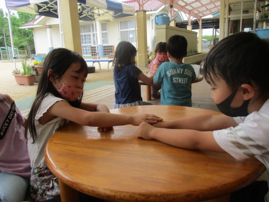 カードめくりやひらがなブロックで遊んでいる中、この日はたまたまテラスに小さな石があり、それを拾って「どっちにあるでしょう」というゲームをこどもたちが考えてしていました。
