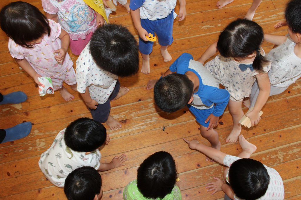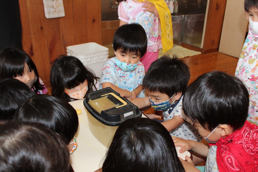 2021年06月23日 突然の来客 3歳児 つき 虫探しに夢中のこどもたちの元に、毎日のように虫たちが訪れます。 昨日はおやつの時間に迷い込んだトンボ! 今日はお昼寝前にやってきたカミキリムシ! 珍しい来客に大騒ぎのこどもたちです。 怖がっていたこどもたちも友だちの影響で恐る恐る手を出して... 虫かごに入れて騒ぎはひと段落し、怖がるこどももひと安心。 興味津々で、われ先にと覗き込むこどもたちです。 一覧へ戻る