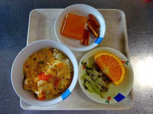 2021年07月06日 給食室(7月1日の給食、おやつ) 給食室 昼食 ・木の葉丼 ・キャベツとなすのもみ漬け ・オレンジ おやつ ・グレープフルーツゼリー ・シガーフライ 『木の葉丼』には、鶏肉・油揚げ・かまぼこ・たまねぎ・にんじん・ 干ししいたけ・ねぎ・卵が入っています。 基本的な『木の葉丼』は肉を使わず、かまぼこやさつま揚げなどを 卵でとじた、関西では定番の節約メニューです。 かまぼこや三つ葉などを、木の葉に見立てたことが 名前の由来とされています。 干ししいたけ、昆布、かつお節のだしが効いた、 優しい味に仕上がりました。 一覧へ戻る