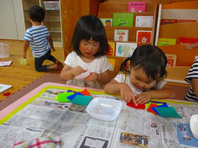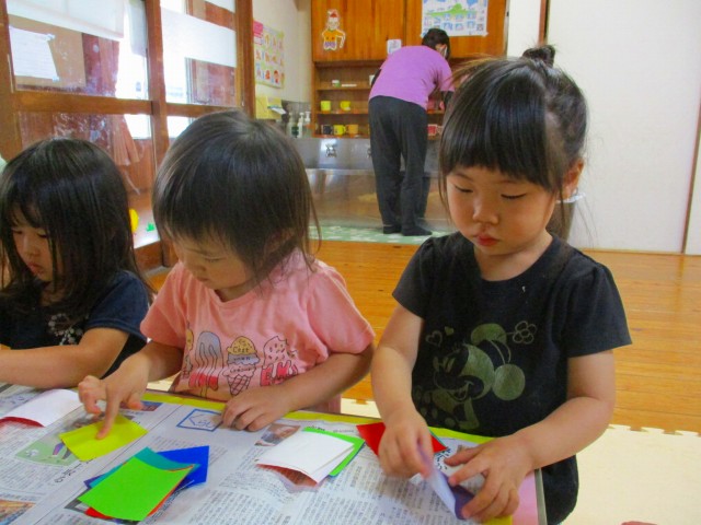 2021年07月06日 のりを使ってみよう 2歳児 にじ のりを使って七夕飾りを作りました。 保育者がどれだけのりをつけるか伝えると、「これぐらい」と聞きながらのりをつけていました。 おりがみをのりで繋げました。 一覧へ戻る