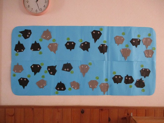ちなみに、おたまじゃくしはこどもたちが自分で好きな場所に貼りました。