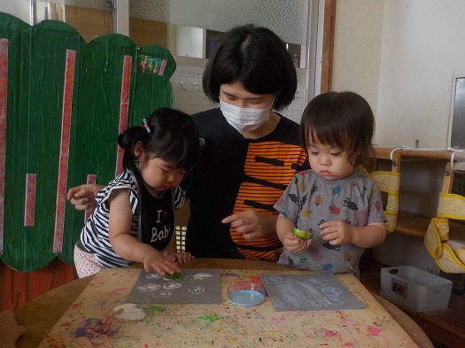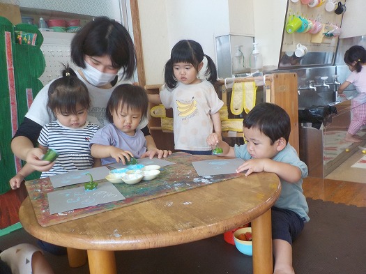 2021年07月07日 ぺったん 1歳児 ゆき 夏野菜をカットして、野菜スタンプぺったん。 タンポとは違って、いい味のスタンプ柄ができていました。 涼しげな模様…何に変身するか、楽しみにしてください。 一覧へ戻る