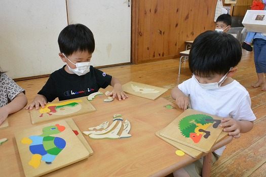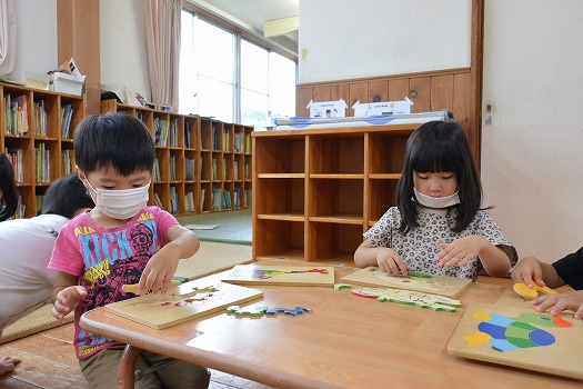 2021年07月10日 パズル得意だよ 3歳児 つき 好きなあそびの時間にパズルを選んで遊んでいるこどもたちです。 完成したパズルを「見て」と得意げに教えてくれます。 「すごいね」と声をかけると他のものにも次々に挑戦しています。 4月に比べ、完成するまでの時間がとても早くなっているようです。 一覧へ戻る