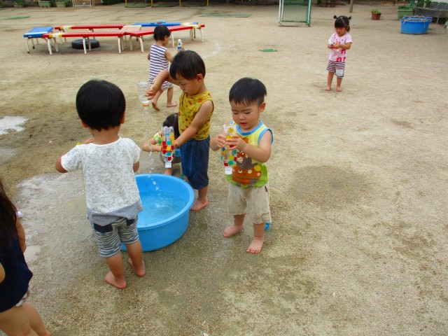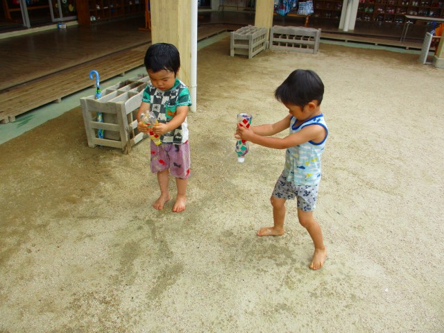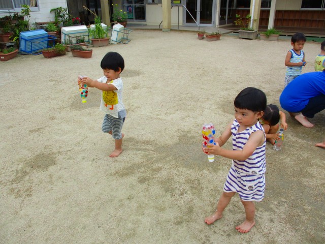 自分たちでシールを貼ったペットボトルの水鉄砲であそびました。