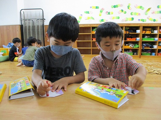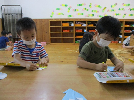2021年07月15日 おばけなんてないさ~♪ 4歳児 ほし 7月は『おばけなんてないさ』と『すうじのうた』を歌っています。 『おばけなんてないさ』は5番まであるので くり返し歌うことで少しずつ歌詞を覚えてきました。 今月中に全部覚えられるでしょうか?! おばけのうたを歌っているということで 今月は折り紙でおばけを折りました。 春から何度も折っている三角は角と角をそろえて 折るのがどんどんうまくなってきています。 折ったおばけに顔を描いたら完成です。 どんなおばけができあがるのか、お楽しみに♪ 一覧へ戻る